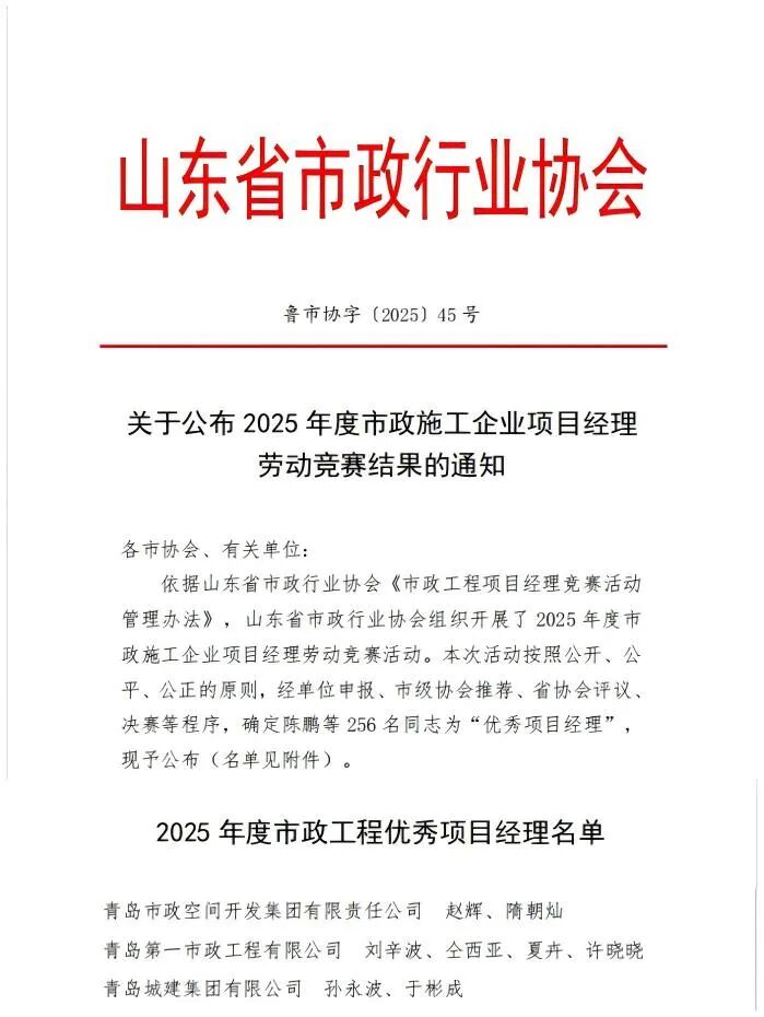 近日,山东省市政行业协会公布了2025年度市政施工企业项目经理劳动竞赛结果。集团共有8名项目经理脱颖而出,荣获“优秀项目经理”称号,充分展现了集团在市政建设领域的专业实力与人才优势。