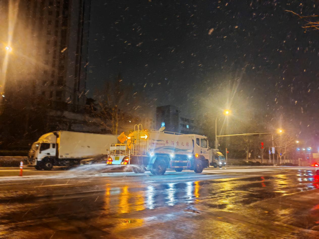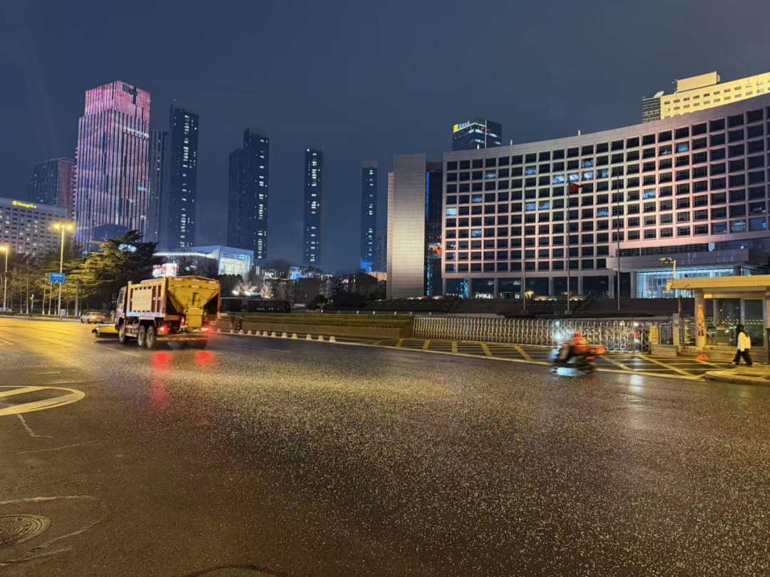 风雪夜战,迎寒而清。自18日夜间起,雪势持续加大,集团立即组织第一市政公司、城建公司等单位,按照“以雪为令、随下随清、雪停路畅”原则,对山东路、福州路、南京路、黑龙江路、香港路、东海路等6条主干道及福辽立交桥共计102万平方米责任区域,展开连夜不间断巡查和机械化除雪作业。在严寒深夜里,作业人员与机械配合,持续撒布固体和液体融雪剂,彻夜奋战近10小时,有效遏制道路结冰,确保次日早高峰通行顺畅。