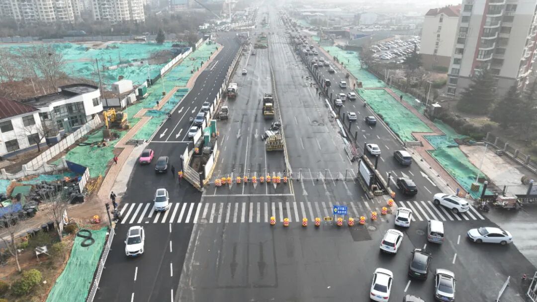 为配合劲松五路跨线桥桩基施工,项目对黑龙江路(杨家群丽景苑路段至海尔工业园以南路段)进行交通调流。调流后,车辆通行方式调整为原中间双向六车道,改为两侧双向六车道。此次调流于当晚7时58分正式放开交通通行,为桥梁主体施工提供作业面,保障工程顺利推进。